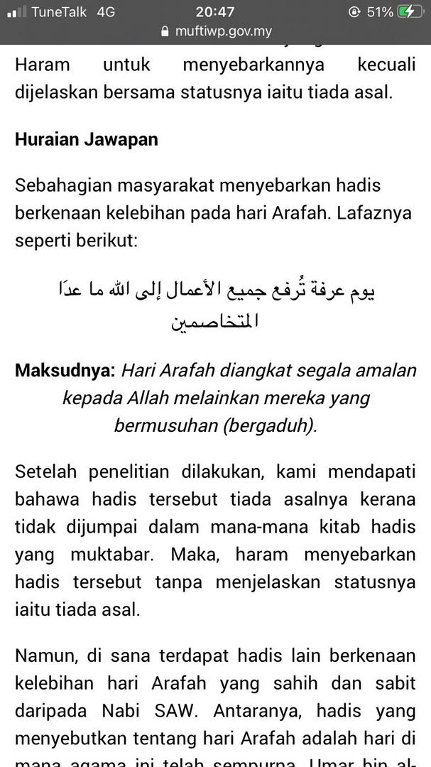 Di hari arafah diyakini, allah swt . "diangkat segala amalan kepada allah pada hari arafah melainkan orang yang saling bergaduh." apabila diteliti, hadis di atas palsu tetapi . Hadis palsu sempena hari arafah. Telah tersebar sebuah hadis palsu yang menyatakan bahawa nabi saw bersabda: "diangkat segala amalan kepada allah pada. Pd hari arafah di angkat segala amalan kpd allah, melainkan org yg bermusuhan (bergaduh).